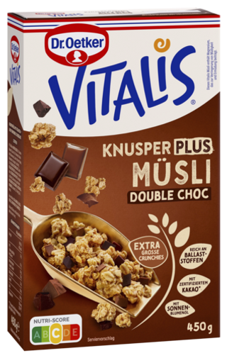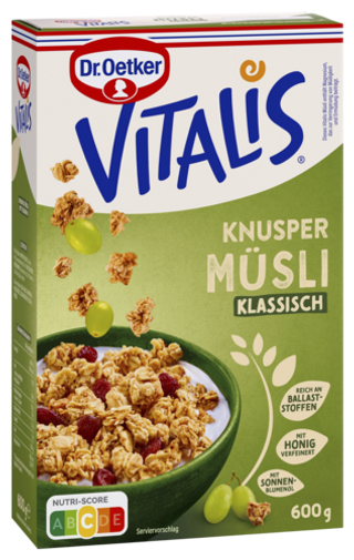 Start je dag met Vitalis van Dr. Oetker – een heerlijke keuze voor een knapperig en smaakvol ontbijt. Vitalis Krokante Muesli combineert goudbruin geroosterde havervlokken met zorgvuldig geselecteerde ingrediënten zoals noten, chocolade of rozijnen. Met varianten als Klassiek, Double Choco, Noten en Choco biedt Vitalis voor iedereen een smaakvolle start van de dag. Vitalis – een knapperige start voor een goed begin van je dag!