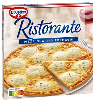 Ingrediënten: TARWEBLOEM, 19% tomatenpuree, 10% MOZZARELLA KAAS, 10% EDAMMER KAAS, water, SLAGROOM, raapzaadolie, 4,1% EMMENTALER KAAS, bakkersgist, 0,8% BLAUWSCHIMMELKAAS, zout, suiker, basilicum, SOJASAUS (water, SOJABONEN, zout, TARWEBLOEM), olijfolie extra vierge, gemodificeerd zetmeel, specerijen, oregano, knoflook. Kan bevatten: MOSTERD.