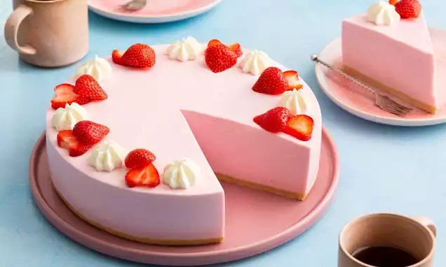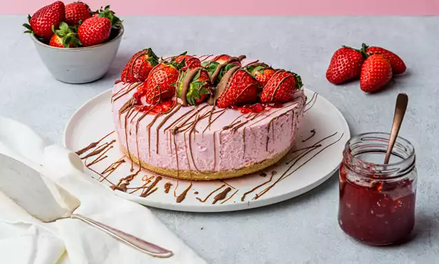 Verdeel de aardbeienstukjes over het midden van de taart.