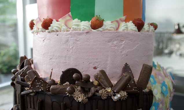 Maak volgens de bereidingswijze op de verpakking de botercrème. Mix de aardbeienjam er heel even door, dat mag nog goed zichtbaar zijn. Smeer de taart royaal af met de botercrème, zodat je niets meer ziet van de taart.