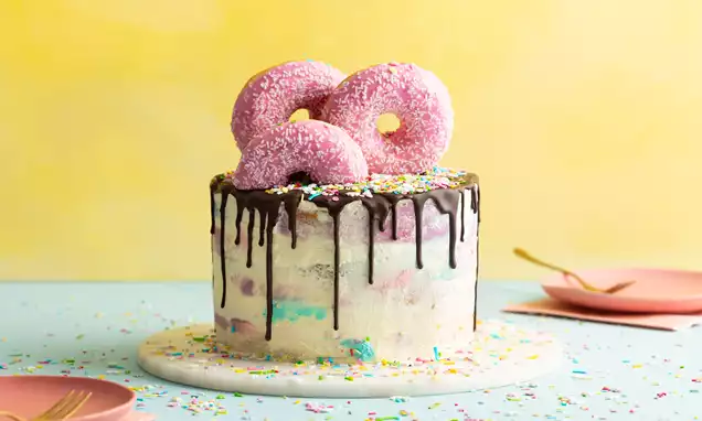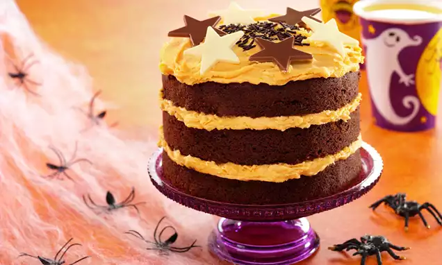 Snijd de afgekoelde taart met een broodmes in twee gelijke helften. Vul de taart met de aarbeienjam en de helft van de hazelnoot-botercrème.