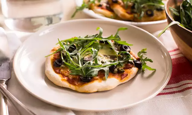 Besmeer de pizzabodems met de crème fraîche en strooi de fijn gesneden uitjes over de bodem.