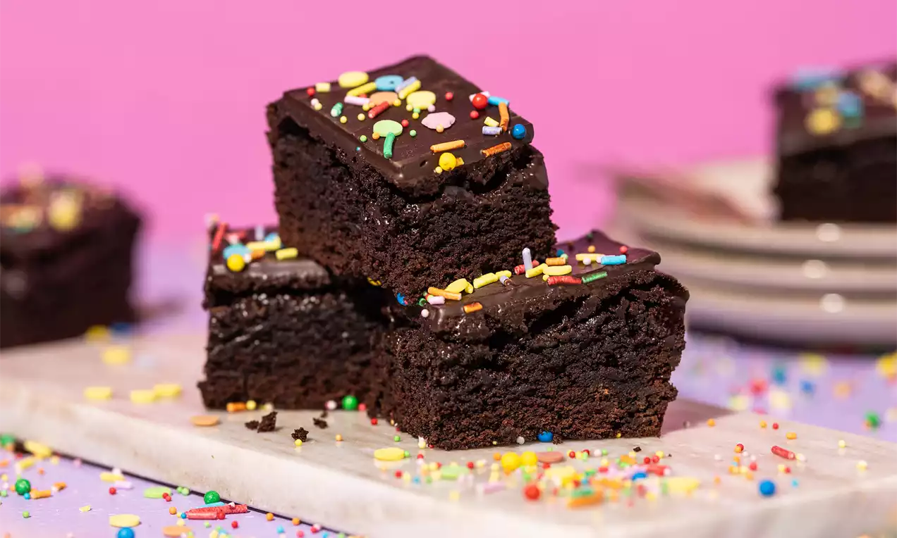 Knip de bovenhoek van het zakje af en schenk het glazuur over de brownies en versier het met de regenboogfantasie sprinkles