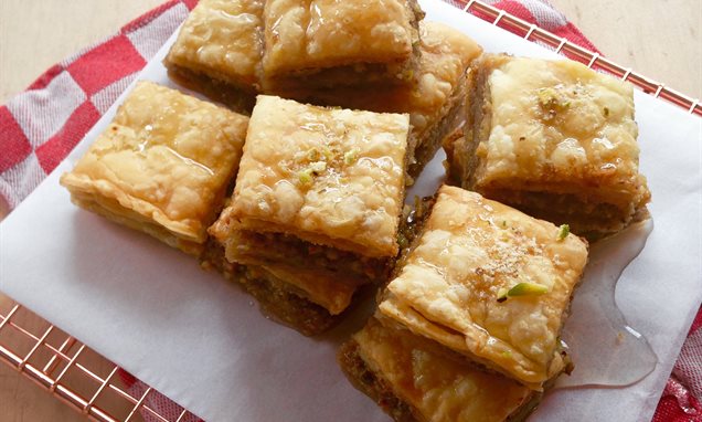 Snijd de baklava in de vorm in plakken of blokjes voor het serveren.