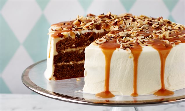 Tot slot leg je de derde taart laag er op. Deze besprenkel je ook met karamelsaus. Daarna bestrijk de hele karameltaart met een laagje botercrème. Zet de taart tot het serveren in de koelkast.