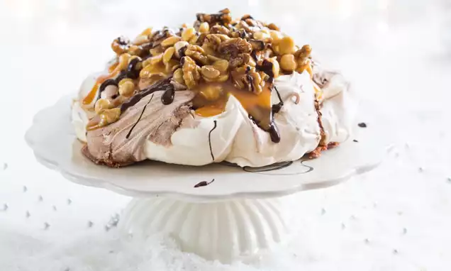 Leg de eerste taartbodem op een mooie schaal. Schenk een beetje karamelsaus over bodem. Bestrijk de bodem daarna met een laagje botercrème.