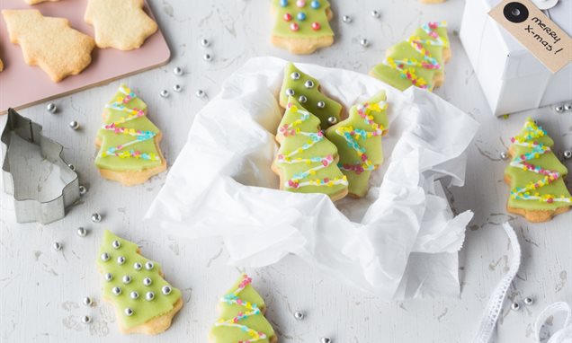 Roer de glazuurmassa goed door elkaar (geen kleurpuntjes meer zichtbaar) en verdeel dit met een lepel over een koekje. Strooi er meteen de kerstdecoratie overheen en ga dan verder met het volgende koekje. Laat de koekjes nu nog minimaal 30 minuten staan zodat het glazuur goed droogt.