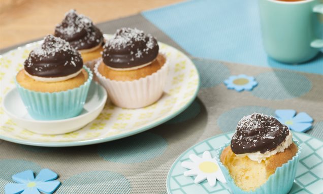 Dip de cupcakes met de kokoscrème in de chocolade, laat even uitdruppelen. Strooi gelijk een beetje kokos op de zachte chocolade. Herhaal dit met alle cupcakes.