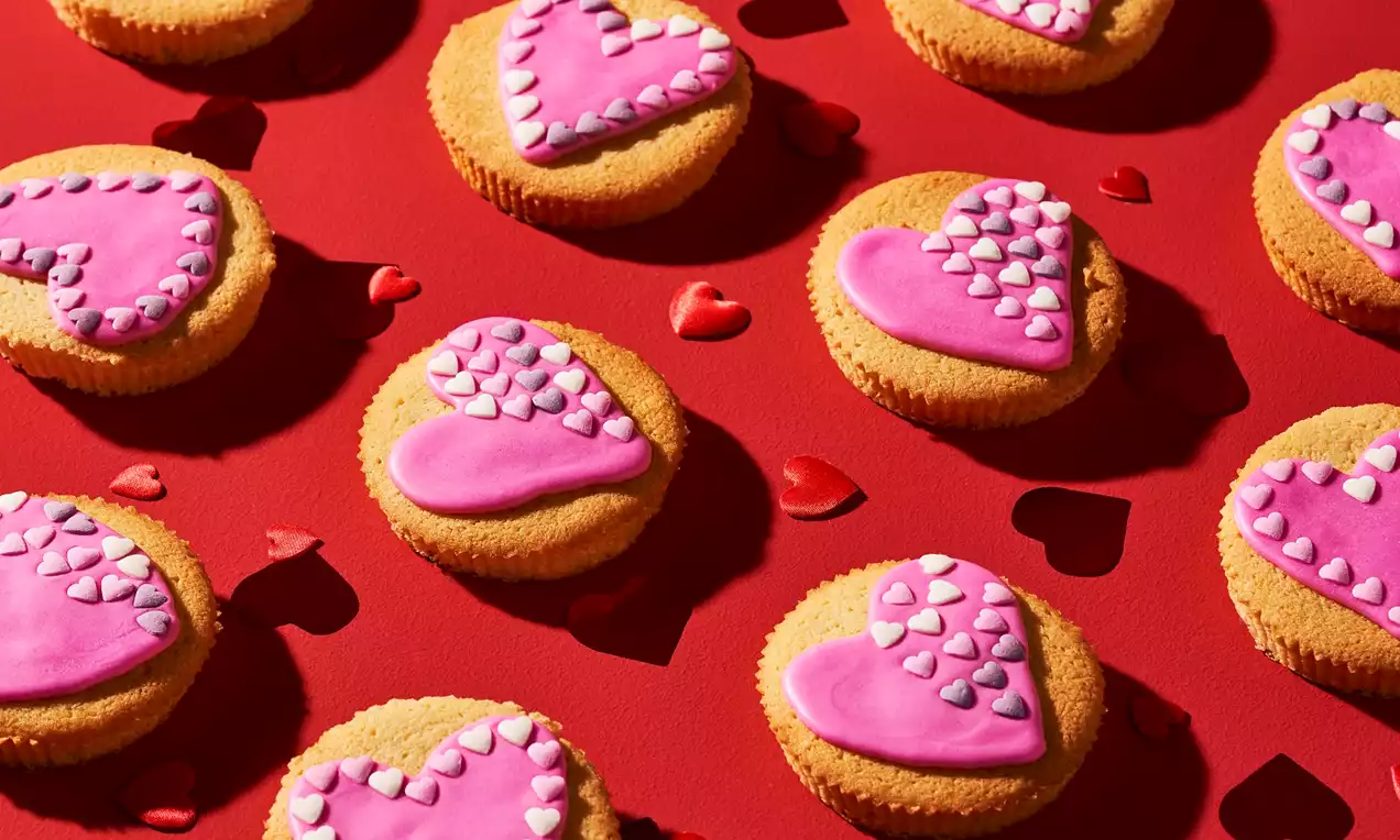 Verdeel de Dr. Oetker suikerhartjes over het nog plakkerige glazuur. Druk eventueel licht aan.