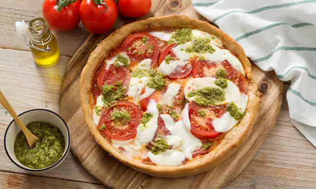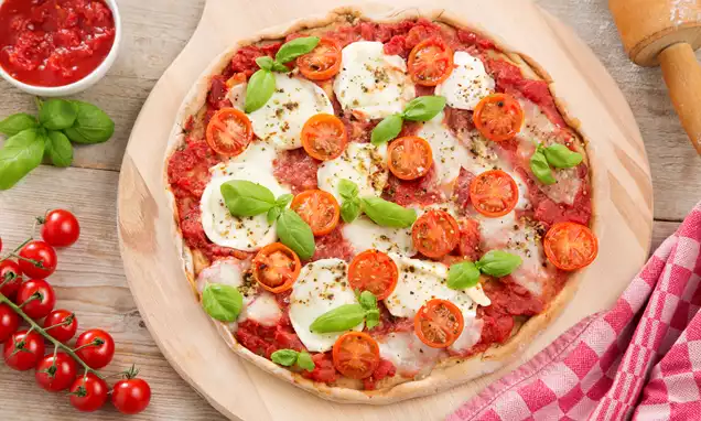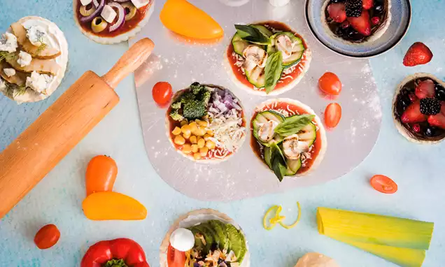 Kneed het deeg na met de hand en verdeel het deeg in vier gelijke delen. Druk het deeg plat, bestrooi met wat bloem en druk verder uit met de hand of met een deegroller. Verdeel de vier pizzabodems over de bakplaat. Maak voor iedere bodem een opstaand randje die je bestrijkt met wat olijf- of zonnebloemolie.