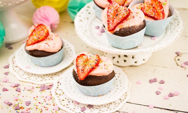 Vul de spuitzak met de botercrème en versier elke cupcake met een hartvorm van romige creme en een plakje aardbei.