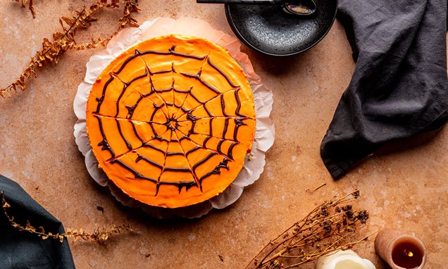 Spuit vanuit het midden van de kwarktaart vijf cirkels met behulp van de Dr. Oetker decoratiestift choco. Trek met behulp van een cocktailprikker ca. 8 strepen vanuit het midden van de taart naar de buitenkant. Zo ontstaat er een spinnenweb.