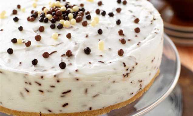 Verdeel de het stracciatella roomtaart mengsel over de bodem en plaats de roomtaart minimaal 3 uur in de koelkast.